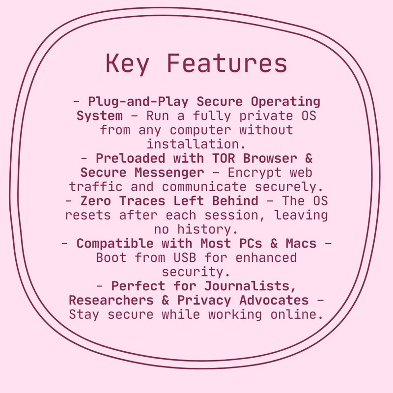 - 🖥️ Plug & Play Bootable USB – Instantly boot Tails OS from this pre-installed USB, no installation required—just plug into any computer and browse securely.