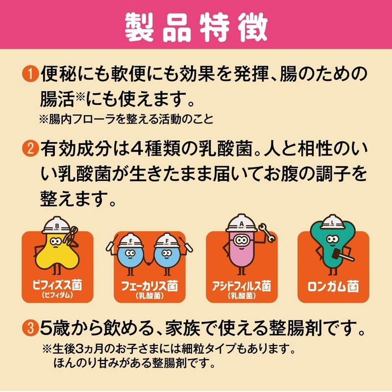- Lactic acid bacteria that work wide from the small intestinal to the coli, suppresses the growth of germs, and helps to condition the disrupted intestinal flora, and improve abdominal symptoms (soft feces, constipation, and abdominal bloss)