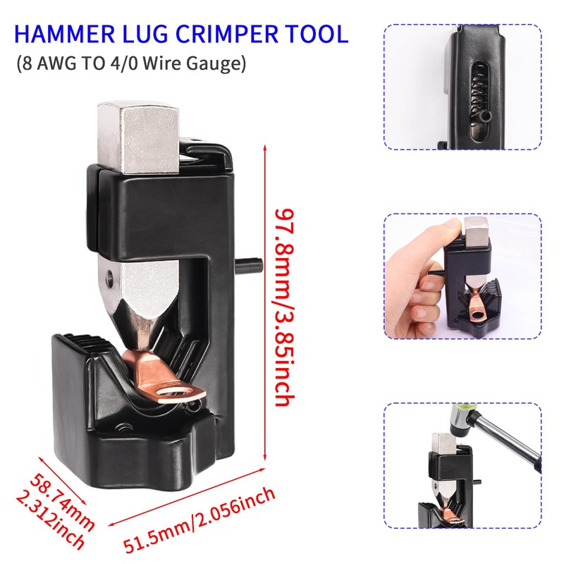 • Hammer Lug Crimper Tool:WIRE GAUGE: Crimps 8 gauge to 4/0 gauge ,8 AWG、6 AWG、4 AWG、2 AWG、1 AWG、0 AWG、00 AWG、000 AWG、0000 AWG