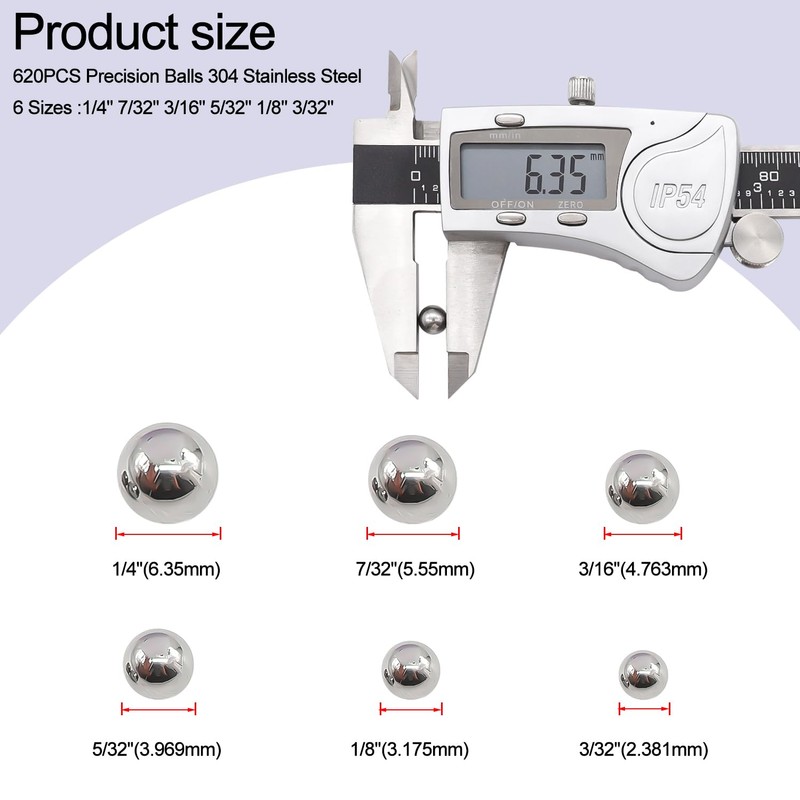 - Product specifications:6 size precision steel balls assortment kit 1/4"(6.35mm),7/32"(5.55mm),3/16"(4.763mm),5/32"(3.969mm),1/8" (3.175mm),3/32"(2.381).
