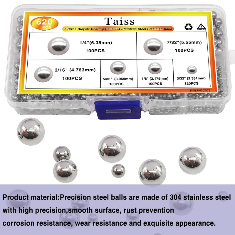 Taiss 620PCS 304 Stainless Steel Precision Balls 6 Sizes 1/4" 7/32" 3/16" 5/32" 1/8" 3/32" Precision Balls Assortment Kit F-086-620PCS