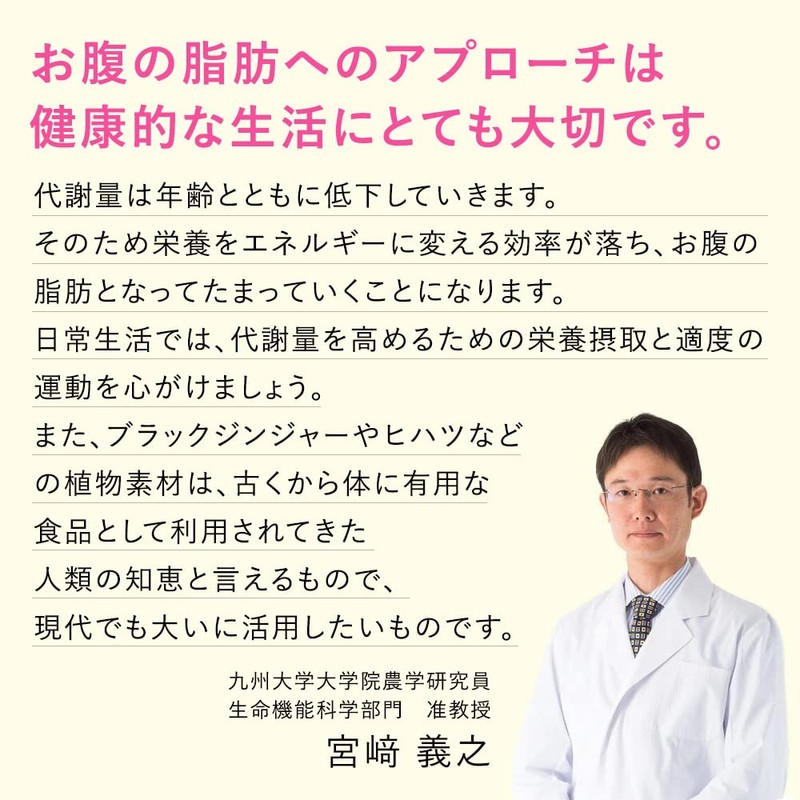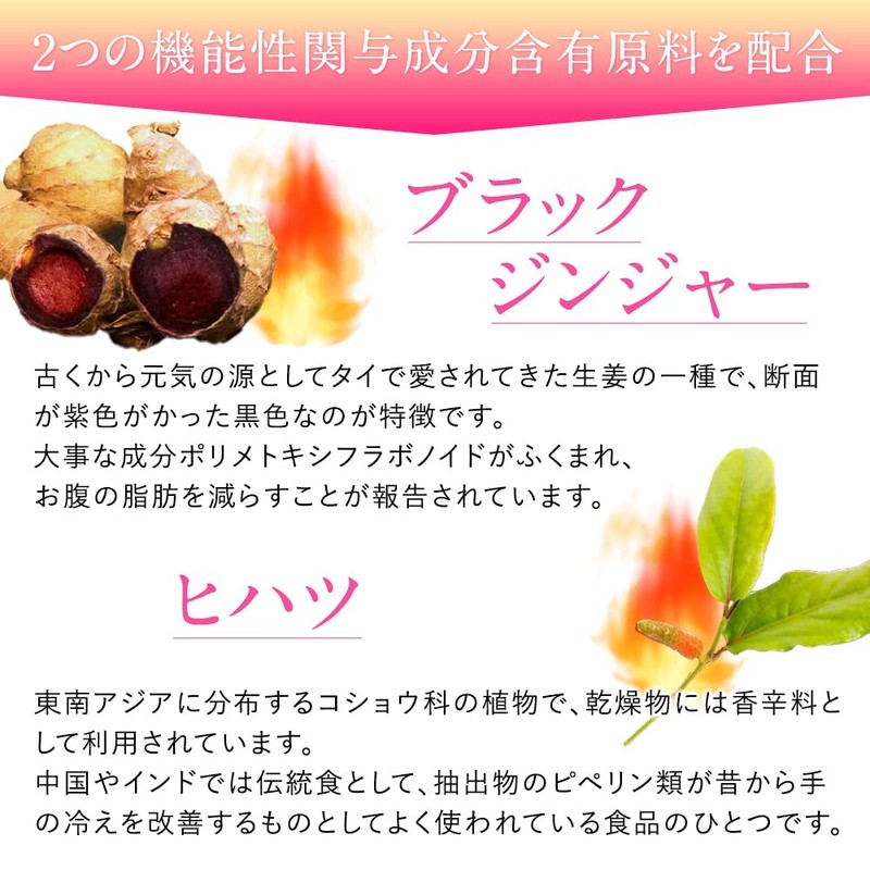 - 【機能性表示食品】 「ブラックジンジャー由来ポリメトキシフラボン」と「ヒハツ由来ピペリン類」を配合し、「お腹の脂肪」「手の冷え」「脚のむくみ」を軽減します。