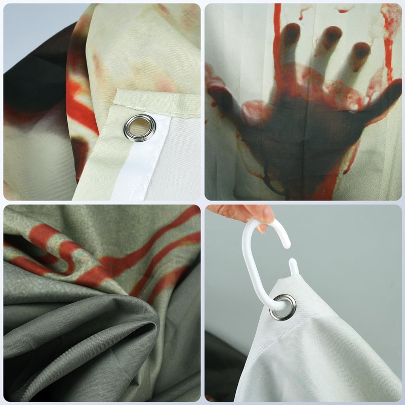 - This creepy shower curtain is perfect for hanging in the bathroom or window. It is suitable for Halloween party decoration, rave party decoration, as an entrance to a haunted house, a toilet door or as a garden door