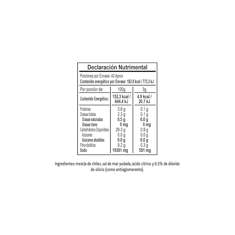 | Flavor: | Mezcla de chilesSal de marÁcido cítricoJugo deshidratado de límónDióxido de silicio |