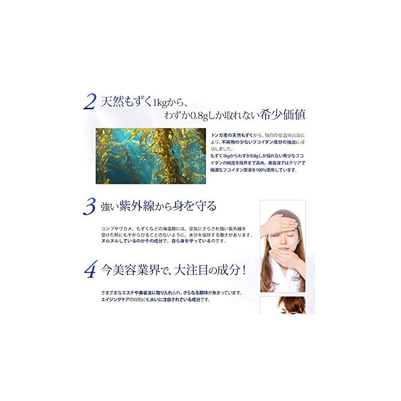 - (High concentration of undiluted liquid serum) This is a 100% pure fukoidan liquid serum derived from tonga. Moisturizes and maintains skin for a long period of time to maintain a transparent and glossy skin.