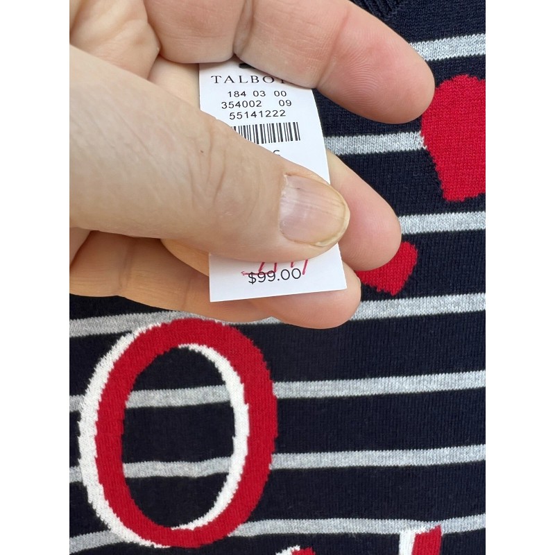 NWT Talbots Fun Navy Gray Stripe Woven Love With Hearts Sweater, 2X. Bust 50”, Length 28”. Originally $99. Enjoy!