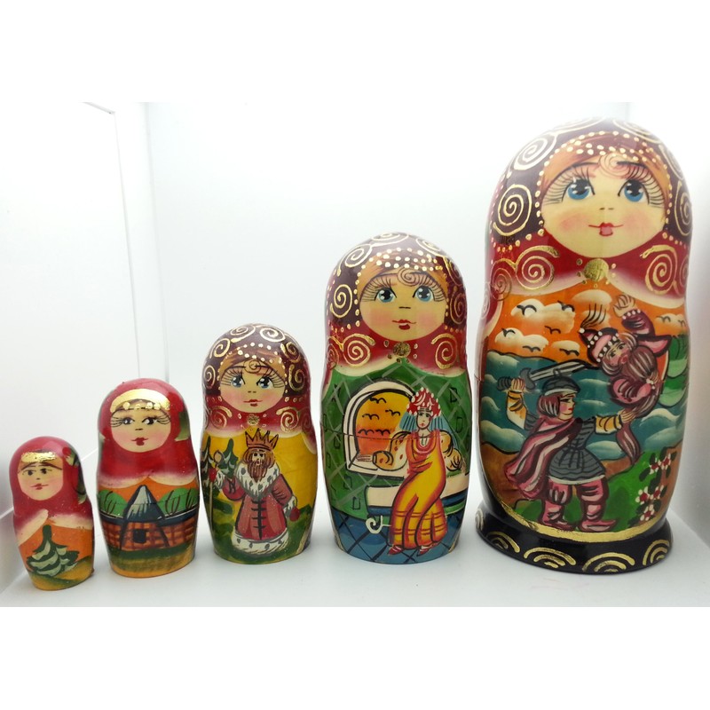Tale of Ruslan and Ludmila Nesting Dolls Russian Hand Carved Hand Painted 5 Piece Set
