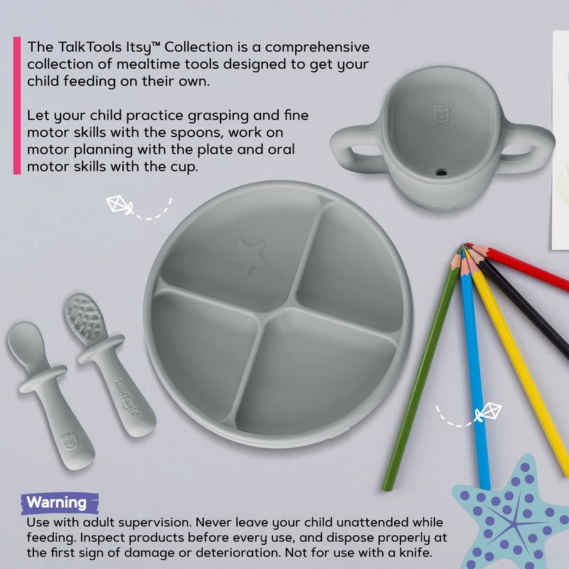 THE TALKTOOLS Itsy new all-inclusive feeding set comes with all the essential items you need in one convenient kit to facilitate this messy eating phase, reduce clean-up, and make meal time at home or on the go a breeze.