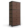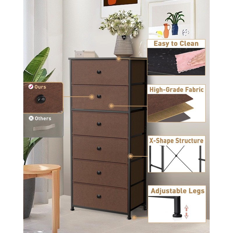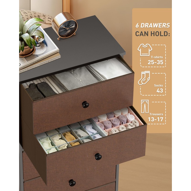 Tall Fabric Dresser for Bedroom, Vertical Storage Organizer Tower with 6 Drawers, Chest of Drawers with Bins, Steel Frame, Wood Top for Bedroom, Closet, Entryway Brown