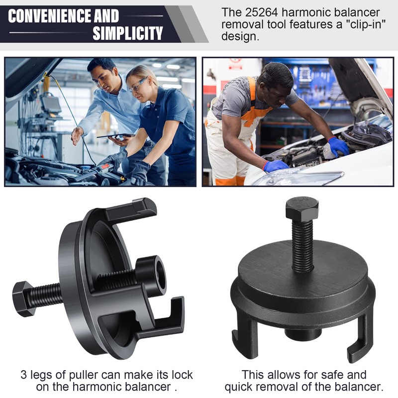 - Novel Design: the 25264 harmonic balancer puller features a clip in design that provides a strong grip, and can be removed without bolting the puller to the balancer, helping to remove the balancer quickly and easily