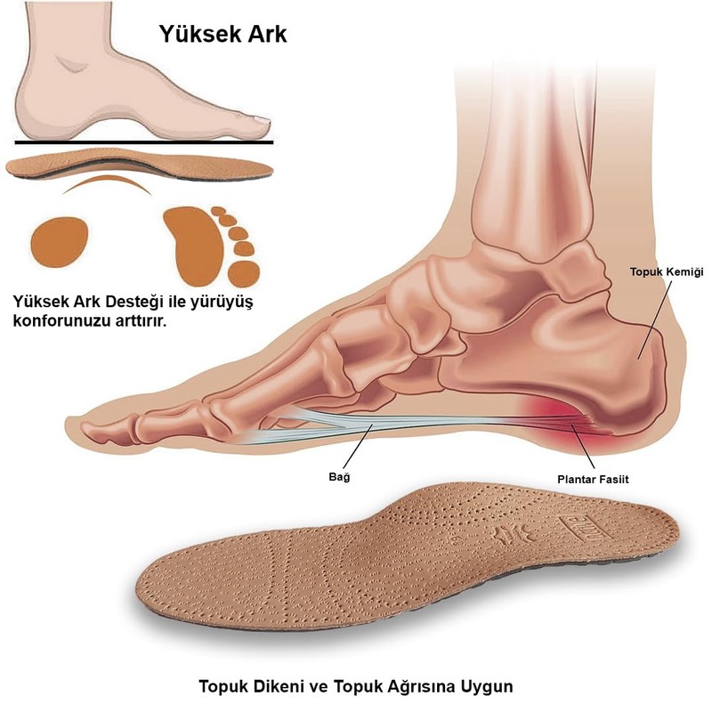 - ARK DESTEĞİ: Güçlendirilmiş ark desteği anatomik ayak şekline göre özel olarak tasarlanmıştır ve içe basma rahatsızlığını gidermeye yardımcı olur. Vücut yükünün daha fazla bindiği metatars başları ve kalkaneal epin bölgesi özel malzemeden üretilmiştir. Ayak ve baldırda oluşan ağrıları azaltır.