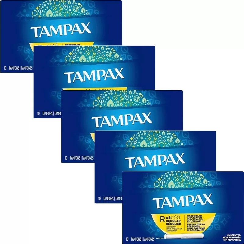 Tampax 5 x Tampax Tampons Regular Absorbency, Unscented 10 Ct with Cardboard Applicator