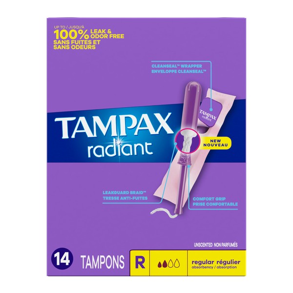 Get confidence and freedom with TAMPAX Radiant Regular tampons. These tampons provide you with up to 100% leak and odor-free protection. You’ll love the Quiet Easy Reseal Wrapper and their fierce, fun-patterned design TAMPAX Radiant tampons have a CleanGrip applicator designed for incredible comfort and a LeakGuard Braid that helps stop leaks before they happen while channeling potential leaks back into the core. Don’t let a little thing like your period stop you from living life to the fullest. For discreet protection on the go, be sure to check out TAMPAX Pocket Radiant tampons.