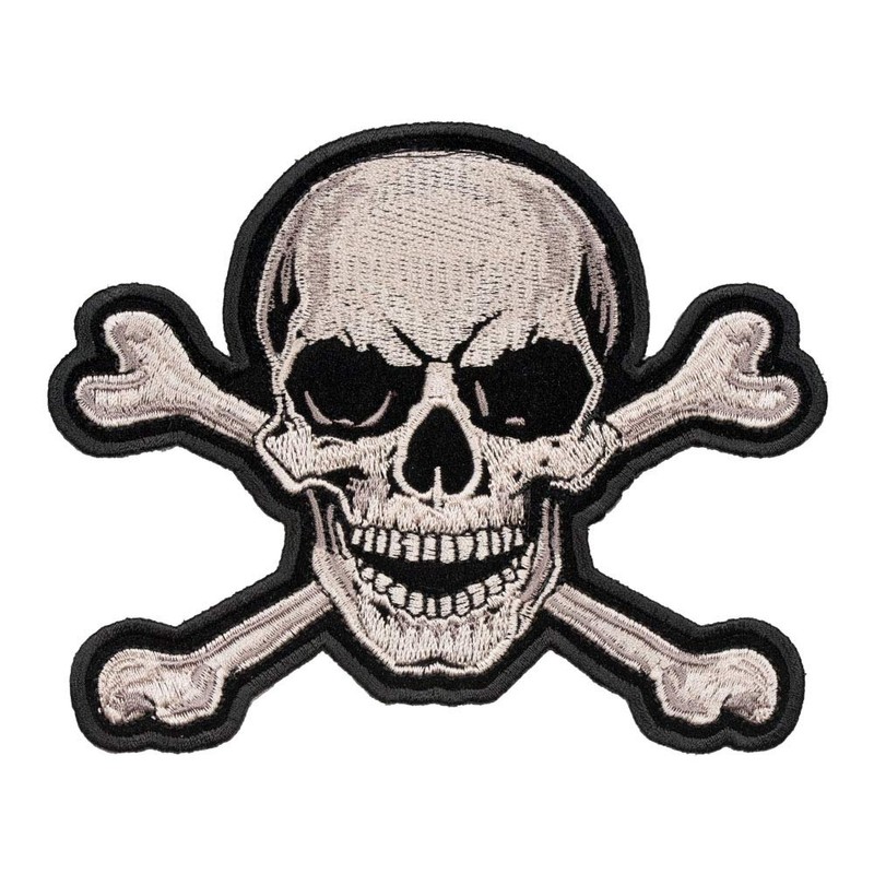 Traditional skull & crossbones in very detailed grey embroidery. Available in large and small sizes.