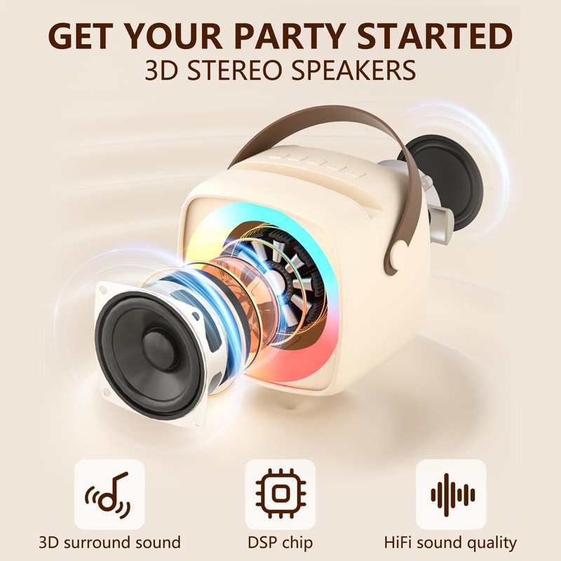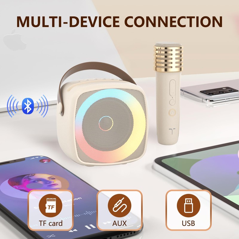 - Bluetooth 5.0 Chip & Wide Compatibility — This 3-in-1 karaoke set is equipped with Bluetooth 5.0 technology, which ensures instant pairing, more stable transmission and greater range. In addition, you can connect your devices via AUX/TF card (not included) and is compatible with iPhone, Android phones, PCs, etc.