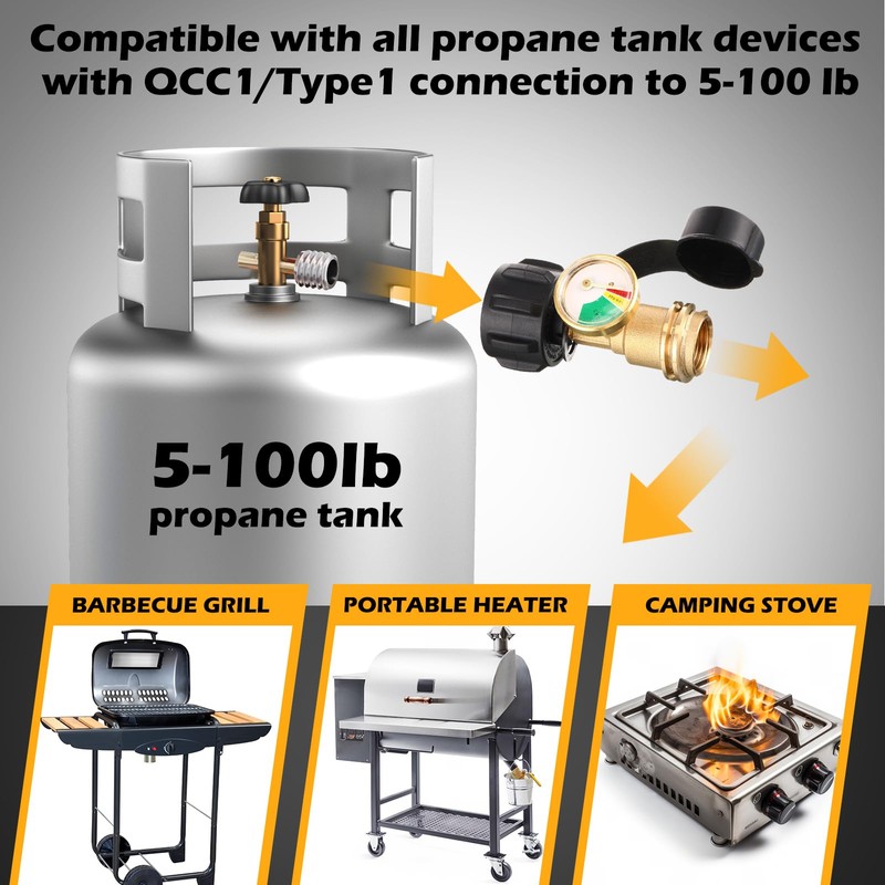 • Hassle Free Installation: the interface of the propane tank utilizes an internal thread connection type and includes a dust cover for added protection; It's simple to install, requiring no tools, and can be set up in less than 2 minutes; The propane tank gauge is designed to connect to gas tanks ranging from 5 - 100 lbs and to the hose of a propane appliance