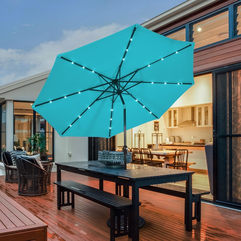 Our patio umbrella with lights is not only the best choice for shading during the day but also for lighting at night!Made of premium polyester fabric, this umbrella shows excellent durability and will remain elegant even when used outdoors for a long time. A 1.5” diameter iron pole and 8 sturdy ribs provide strong support to help resist warping and other damage in the wind. The convenient button tilt mechanism can adjust the angle of the canopy to block direct sunlight in all directions when the sun position changes. The innovative crank allows you to effortlessly open and close the umbrella in seconds. Moreover, with 24 built-in LED lights, our patio umbrella will create a romantic atmosphere in the evening.