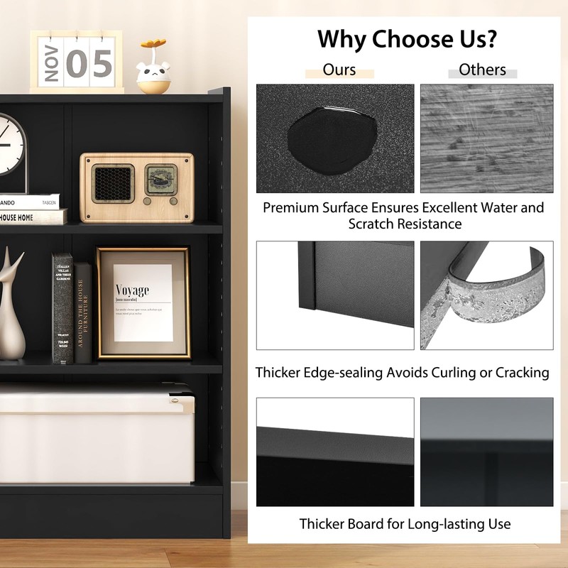 - [Sturdy Structure with Anti-toppling Device]: Thicken engineered wood and MDF means excellent durability, great sturdiness and longer service life. When set against the wall, the bookcase can be attached to the wall with anti-toppling device to prevent wobbling or tipping over. The raised edge also prevent