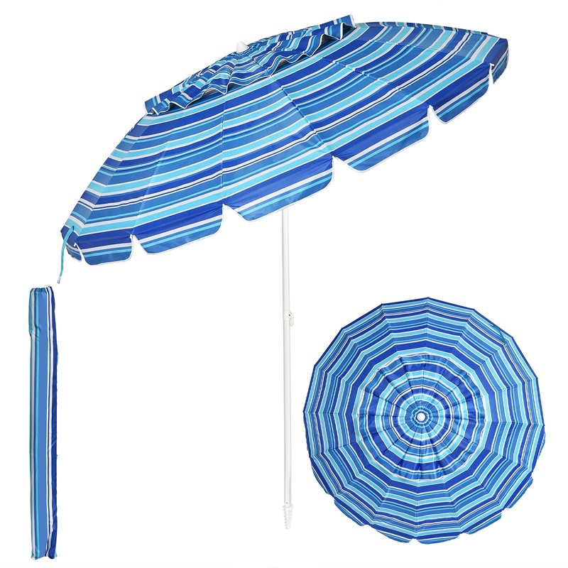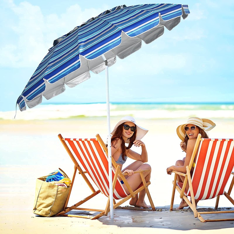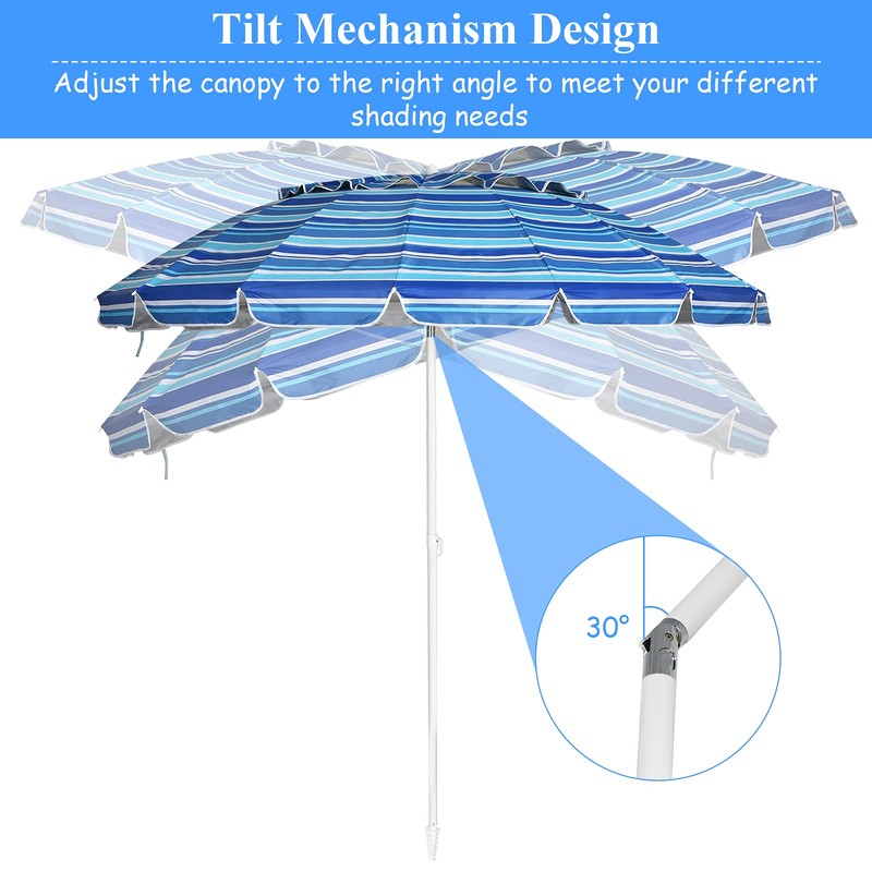 8FT beach umbrella is a good solution to various occasions, and you can enjoy your leisure time in a cool environment with your friends and family.The silver-coated polyester fabric canopy provides maximum protection for your skin so that you don't have to worry about your skin getting sunburned. Thanks to the tilt mechanism, you can maximize your shade all day long by adjusting the angle of the canopy. Supported by heavy duty iron frame and 16 sturdy fiberglass ribs, the beach umbrella is strong enough to withstand breeze. For extra convenience, the umbrella can be divided into several parts and put in a bag for easy transportation. What's more, the compact umbrella with heavy-duty sand anchor facilitates your installation. If you want to relax in a cool place in summer, our beach umbrella is your good choice!