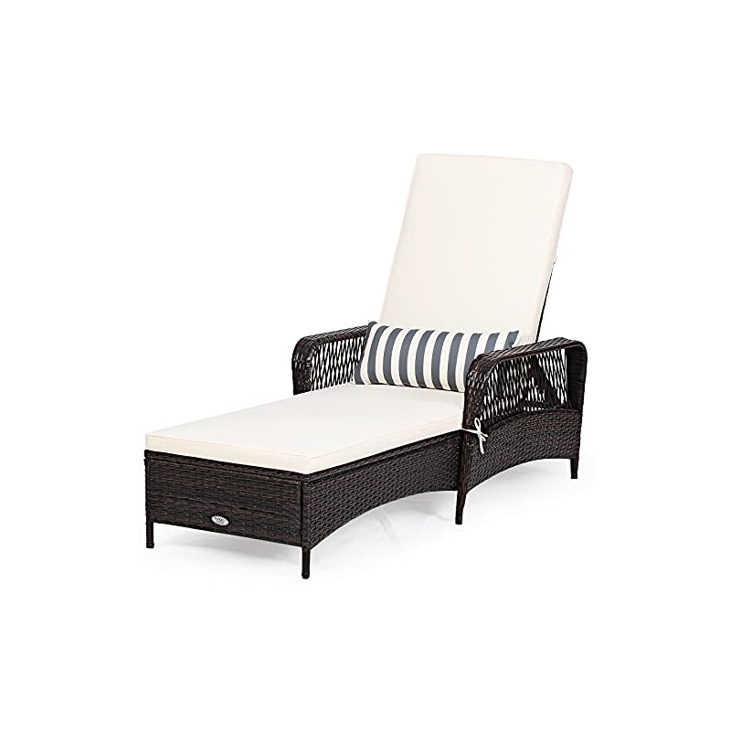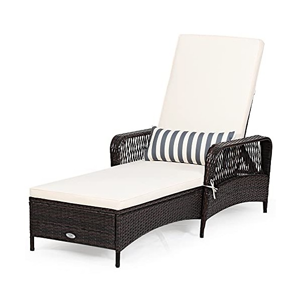 Tangkula Patio Wicker Chaise Lounge Chair, Outdoor Rattan Reclining Chaise w/ 6-Gear Adjustable Backrest, Thick Padded Cushion & Removable Lumbar Pillow, Ideal for Lawn, Beach, Balcony (Mix Brown)
