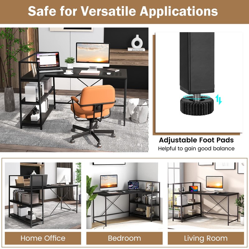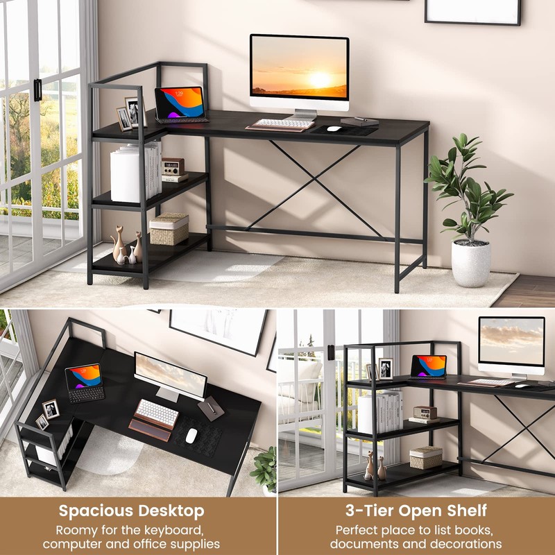 Tangkula Reversible L-Shaped Computer Desk, Space Saving Corner Desk with 3-Tier Storage Shelves & Metal Frame, Modern Executive Home Office Desk, PC Laptop Desk Workstation for Small Space (Black)