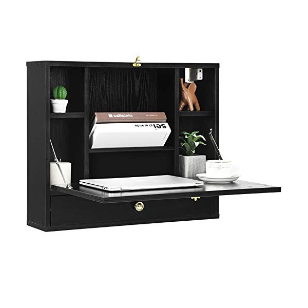Tangkula Wall Mounted Desk, Multi-Function Floating Desk Wall Mount Laptop Desk, Space Saving Wall Mounted Table Wall Desk with Storage Drawer and Shelves (Black)