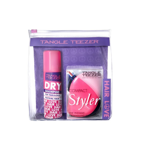 - The bag has a tangle teezer Compact Sylter in pink sizzle and a dry shampoo