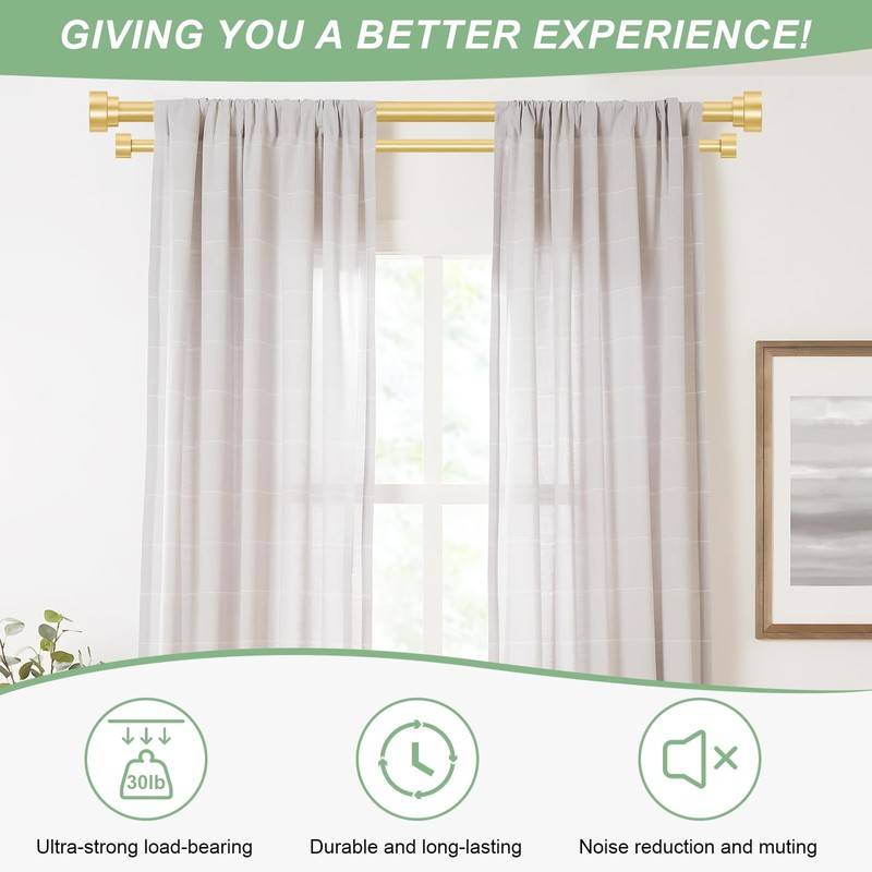 - Easy to Install Double Curtain Rods:Modern decorative double drapery rods shipping package has detailed installation instructions inside,follow the steps,gold double curtain rod can easily complete the installation.Double rod curtain rods 48-84" length can be adjusted by splicing double rods, adjustable double curtain rod which important to ensure that there is at least a 2-3 inch overlap when the telescopic rods are connected to the fixed rods.
