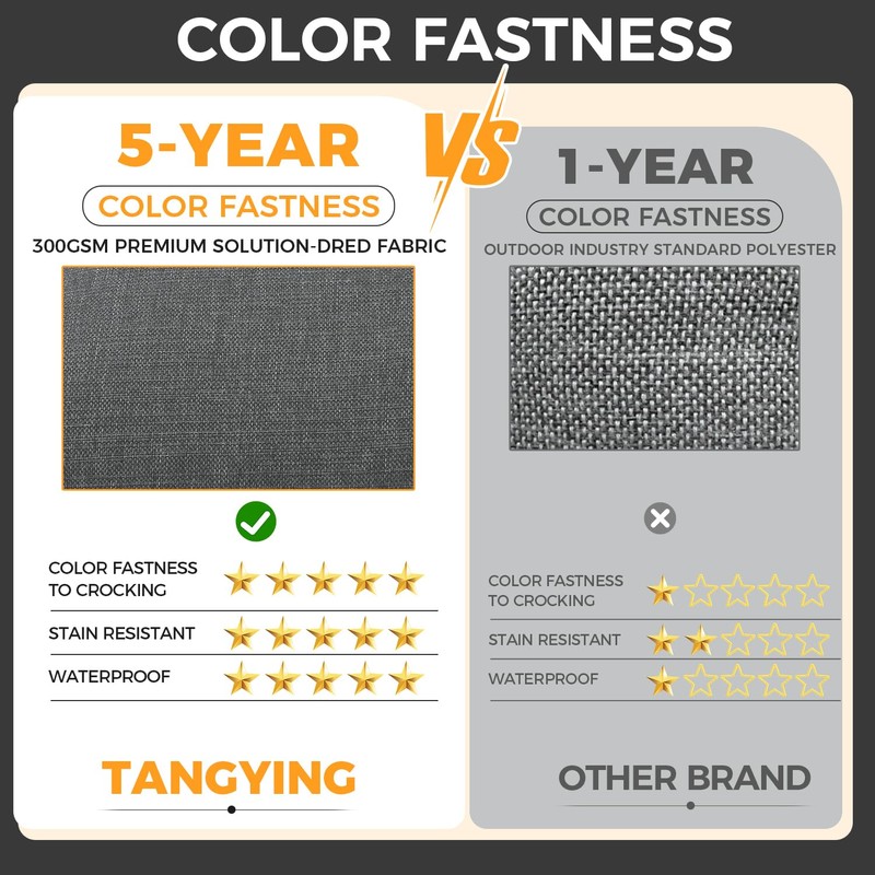 - UV Fadeshield: Outdoor chair cushions utilize solution-dyed technology, ensuring vibrant, deeply ingrained color. With UV resistance, these cushions maintain their color for 5 years of heavy use, outperforming standard cushions.