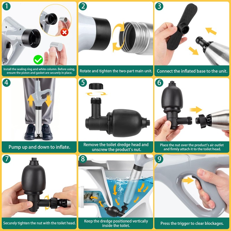 - 【Multi-Purpose Declogger Toilet Tool】Equipped with 3 interchangeable plunging heads, this air plunger is ideal for clearing blockages. From toilets to sinks, floor drains, showers, and bathtubs, it effectively tackles clogs caused by different types of debris. Whether you need a toilet air plunger, a sink unclogger, or a toilet clog remover, this tool is your all-in-one solution for keeping your plumbing clear.