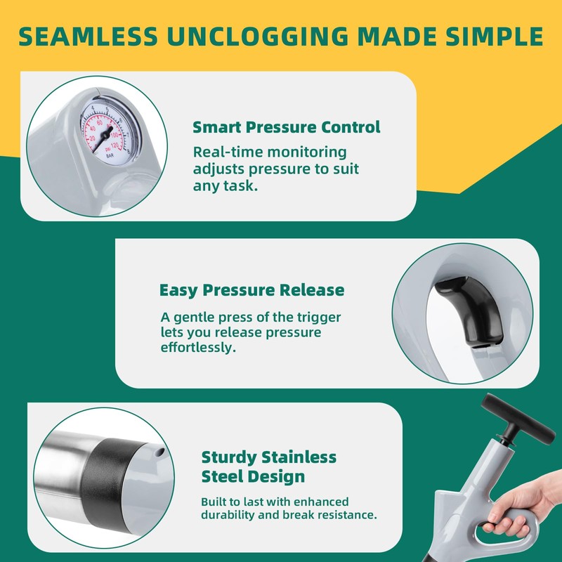 - 【Real-Time Air Pressure Display】This versatile air plunger for toilets features a built-in air pressure gauge for precision and convenience. Adjust the air pressure according to specific needs: 1–2 bar for washbasins, 3–4 bar for kitchen drains, 4–5 bar for toilets, and 5–6 bar for floor drains. With this de-clogger toilet tool, you can confidently monitor and control the pressure, ensuring effective and safe clog removal while avoiding over-pressurization.