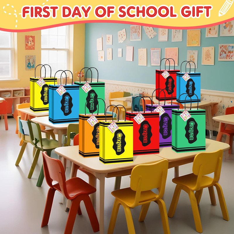 TaoBary 36 Sets Back to School Gift Bags Teacher Appreciation Gifts Paper Bags with Handle Crayon Pencil Notebook Apple Line with Inspirational Cards for Students Gifts Supplies(Crayon Style)