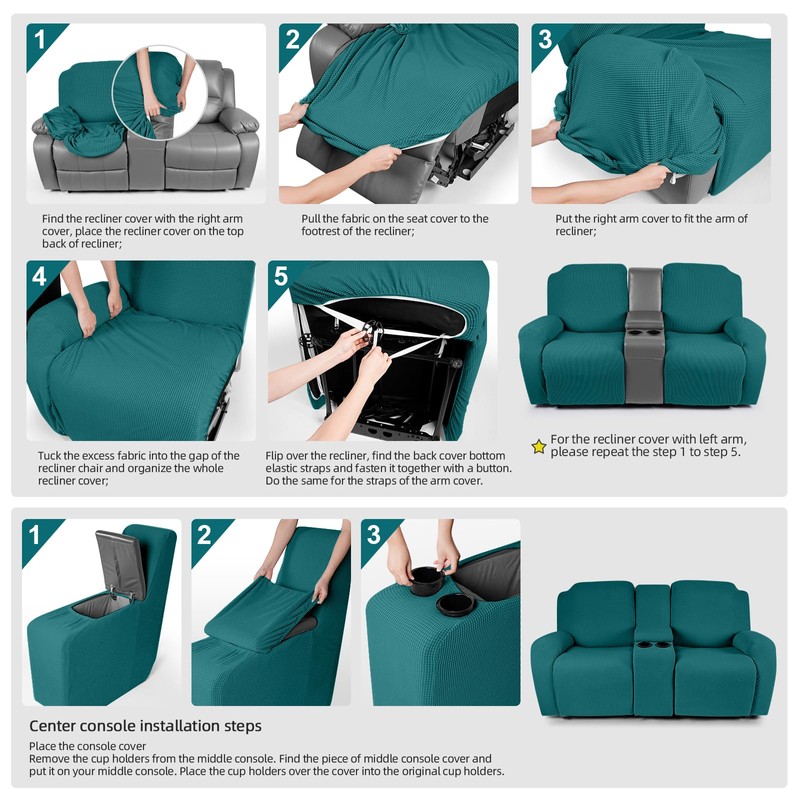 - Perfect Fit: Equipping with bottom elastic band, make the cover stay in place well without moving. Come with 4 pieces cover totally, 2 recliner covers, 2 center console cover. Pockets design are convenient to put your remote control, glasses or any small items on slide pocket for easy access