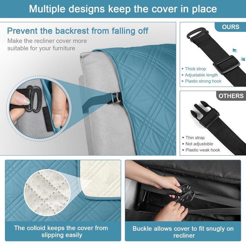 - 【REDUCE SLIP-OFF CONCEPT】Reduce movement around! 1. Solid round colloid design on the back of our recliner cover; 2. Additional flexible elastic straps; 3. Two elastic bands at seat's back side and the matching buckle, to reduce the sliding of the recliner chair slipcover, even on the leather furnitures.