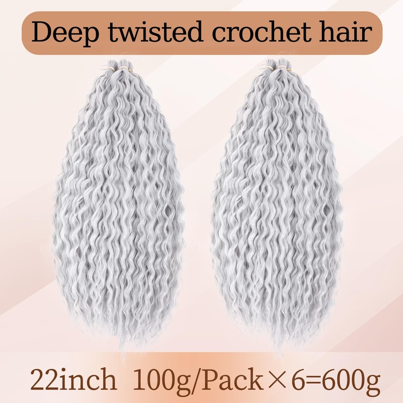 TAOYEMY Deep Twist Crochet Hair 22 Inch 6 Packs Ocean Wave Curly Braiding Hair Extensions Synthetic Curly Crochet Hair for Black Women (Grey, 22 Inches-6 Pieces)