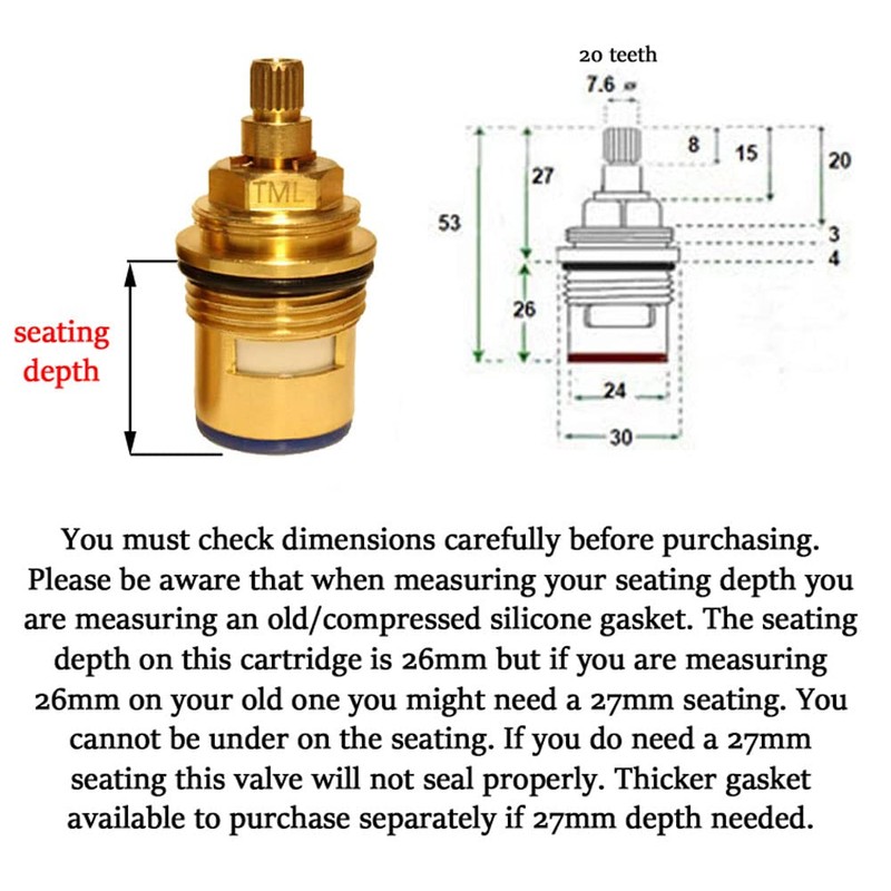 - ✔ **IMPORTANT** This cartridge has a 26mm seating depth. Please be aware that when measuring your old cartridge you are measuring an old/worn gasket. There are many taps which require a 27mm seating depth. If you require 27mm seating this valve will not seal correctly.