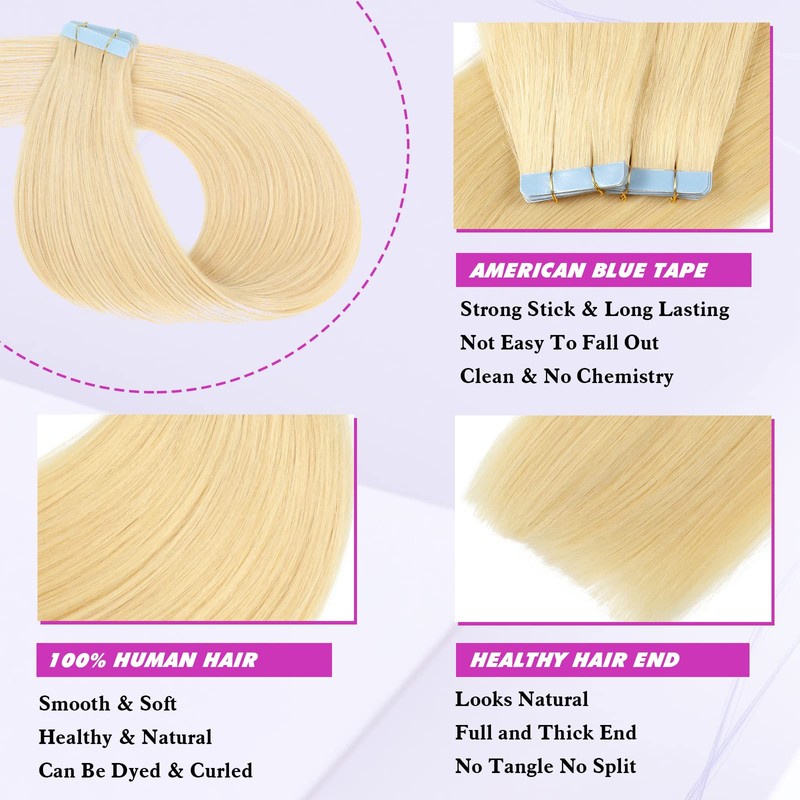 Tape in Hair Extensions Human Hair Bleach Blonde 20Inch 50g Blonde Tape in Hair Extensions Human Hair 20Pieces/Pack Hair Extensions Real Human Hair Tape in for Black Women(20Inch,#613,50g)