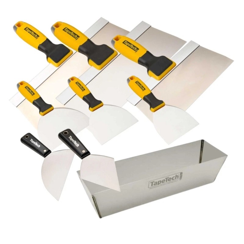 The TapeTech Pro Stainless Steel Hand Tool Set is the ultimate collection for drywall contractors seeking professional-grade tools for taping, jointing, and finishing. This comprehensive set includes premium knives and a durable mud pan, all designed for superior performance, comfort, and precision.