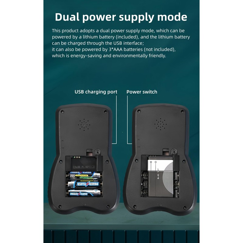 - Dual power supply mode: This product uses a dual power supply mode that can be operated with a lithium battery (included), and the lithium battery can be charged via the USB interface; it can also be powered by 3 x AAA batteries (not included), which is energy-saving and environmentally friendly.