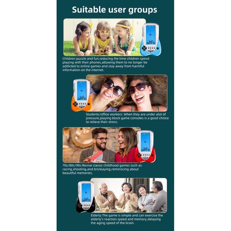 - Suitable user groups: 1) Children: puzzles/fun, reducing the time children spend on the phone so that they no longer become addicted to online games and stay away from harmful information. 2) 70s/80s/90s: revive classic children's games such as racing, shooting and walls and revel in beautiful memories. 3) Elderly: The game is simple and can train the reaction speed and memory of the elderly, thus delaying the aging of the brain. 4) Students/Office Workers When they are under great pressure, playing on block game consoles is a good choice to relieve stress.