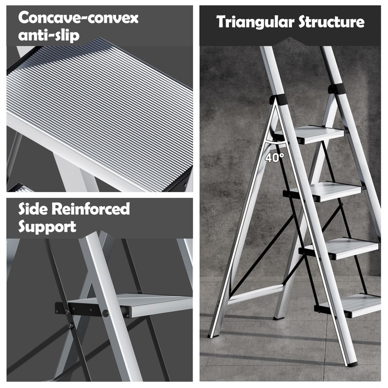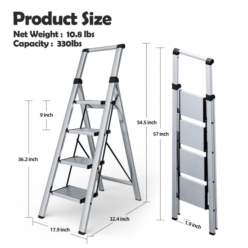 Taranta 4 Step Ladder, Portable Folding Ladder with Wide Pedal, Lightweight Aluminum Step Stool with Convenient Handgrip, 330 lbs Capacity Stepladder for Home, Office - Silver