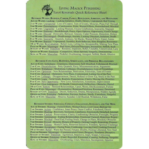 ~ The reversed Tarot card themes and keywords are listed for all of the Major Arcana and Minor Arcana, making it easy to recall the essence of each card's reversed meaning. ~ This Tarot Reversals Quick Reference Sheet is 8.5 x 5.5 inches, double sided, printed on sturdy card stock and laminated for durability. This reference sheet is a great companion to the "Living Magick Tarot Learning Cards", flash cards with in-depth information about the themes, meanings, keywords and much more of the cards. You can see them here: http://www.amazon.com/Tarot-Learning-Cards-Study- Flash/dp/0982884400/ref=sr_1_1?ie=UTF8&qid=1319219374&sr=8-1 Also, check out the Tarot Quick Reference Sheet for upright card interpretations here: http://www.amazon.com/Tarot-Quick-Reference-Jadzia- DeForest/dp/0982884435/ref=sr_1_1?s=books&ie=UTF8&qid=1319219424&sr=1-1 Together these make an excellent system for learning and remembering the fundamental meanings of the Tarot.