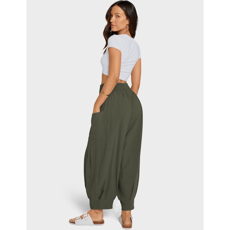 TARSE Women Linen Pants Summer Casual Loose High Waist Palazzo Harem Pants 2024 Beach Travel Vacation Outfits, ArmyGreen, XL
