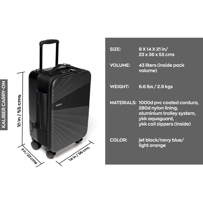 - TOP NOTCH QUALITY: Taskin Kaliber carry-on is made from aircraft grade aluminum trolly; smooth, rubberized asymmetric wheels; YKK zippers; 1000D PVC coated waterproof Cordura.