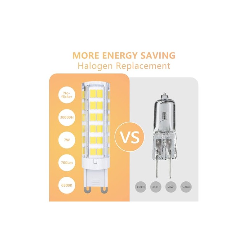 - Energiesparend. G9 7W LED Lampen sind ein ideal Ersatz fr 70 W Halogenlampen, im Vergleich zu herk?mmlichenHalogenlampen verbrauchen G9 LED Leuchtmittel nur 10% Energie, wodurch 90% der Energiekosten eingesparr werden k?nnen