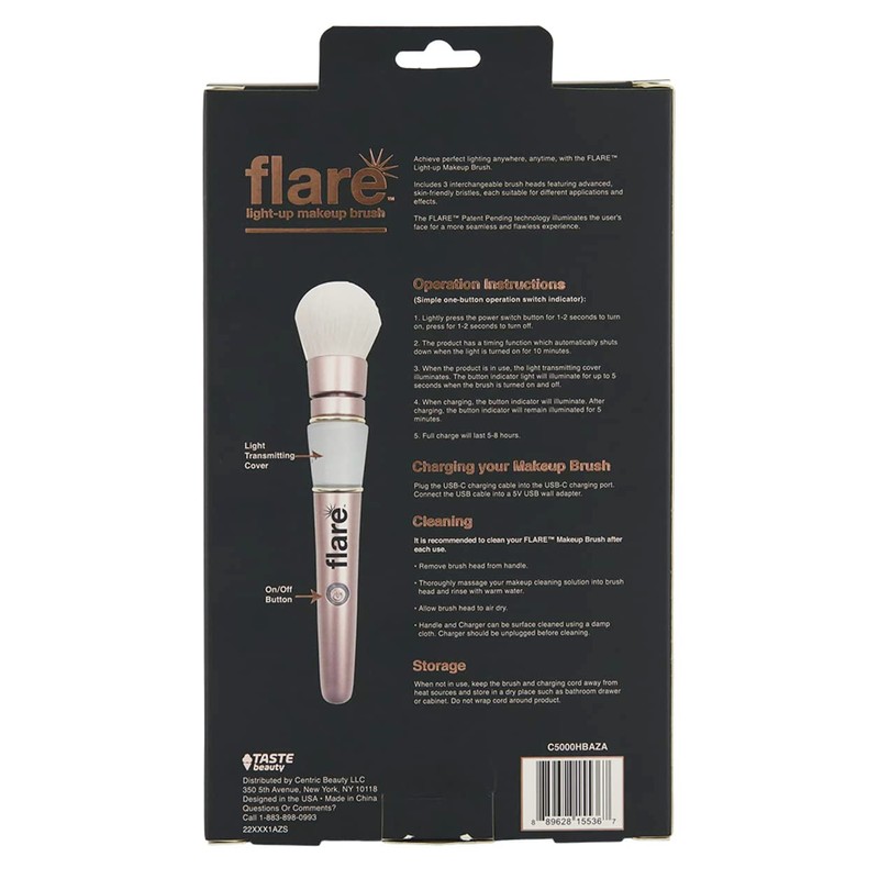 Taste Beauty Flare LED Light-Up Makeup Brush, 3 Interchangeable Heads, USB-C Charger, and Travel Bag