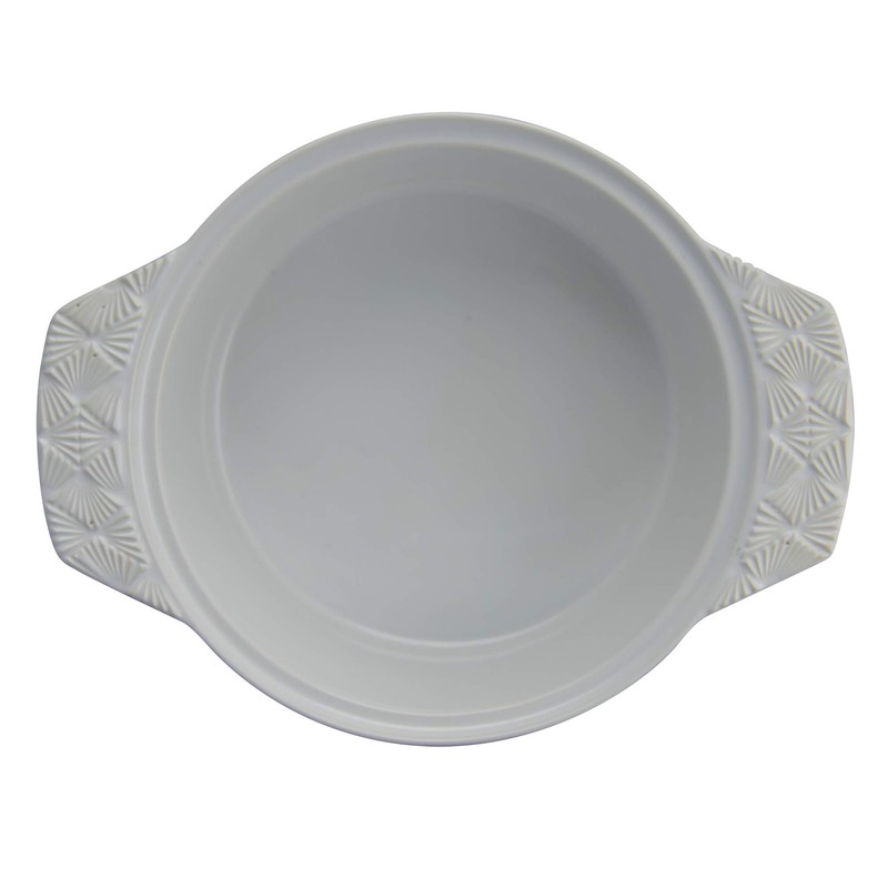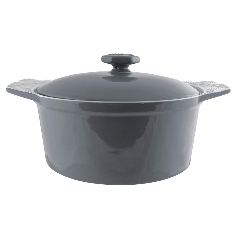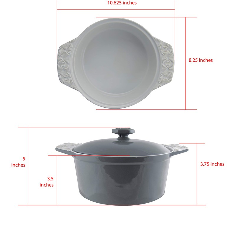 - Stunning embossed design adds touch of flair to handles. Glazed coating won't absorb odors or flavors.