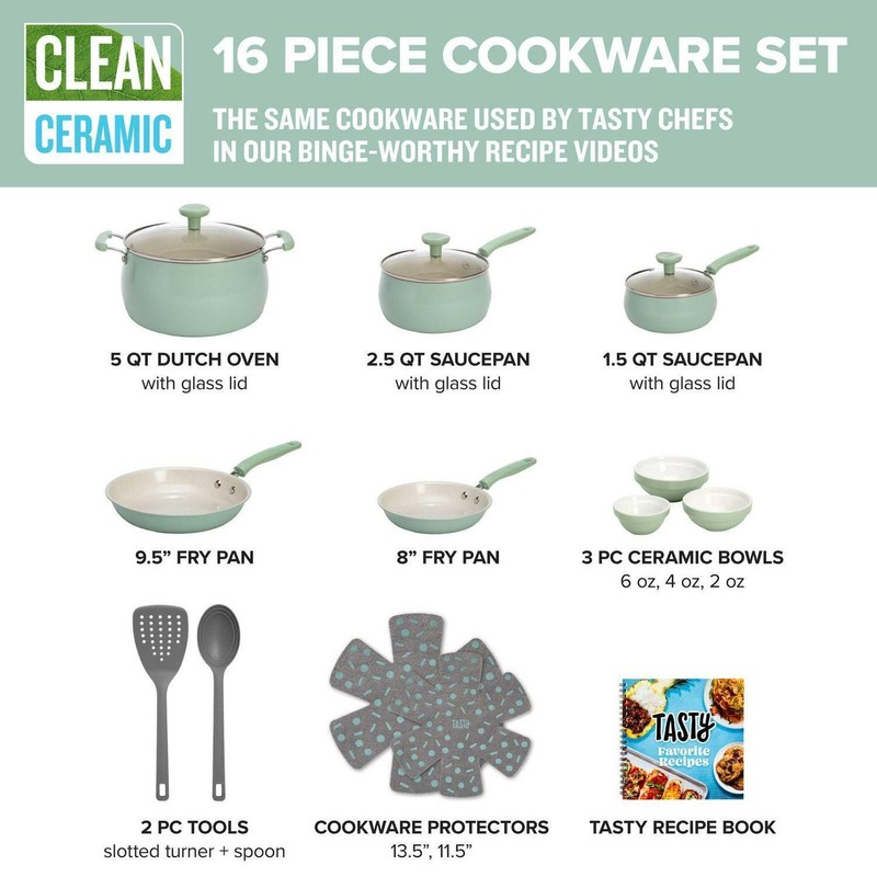 Tasty Clean Ceramic 16 Piece Non-Stick Aluminum Cookware Set, Sage Green