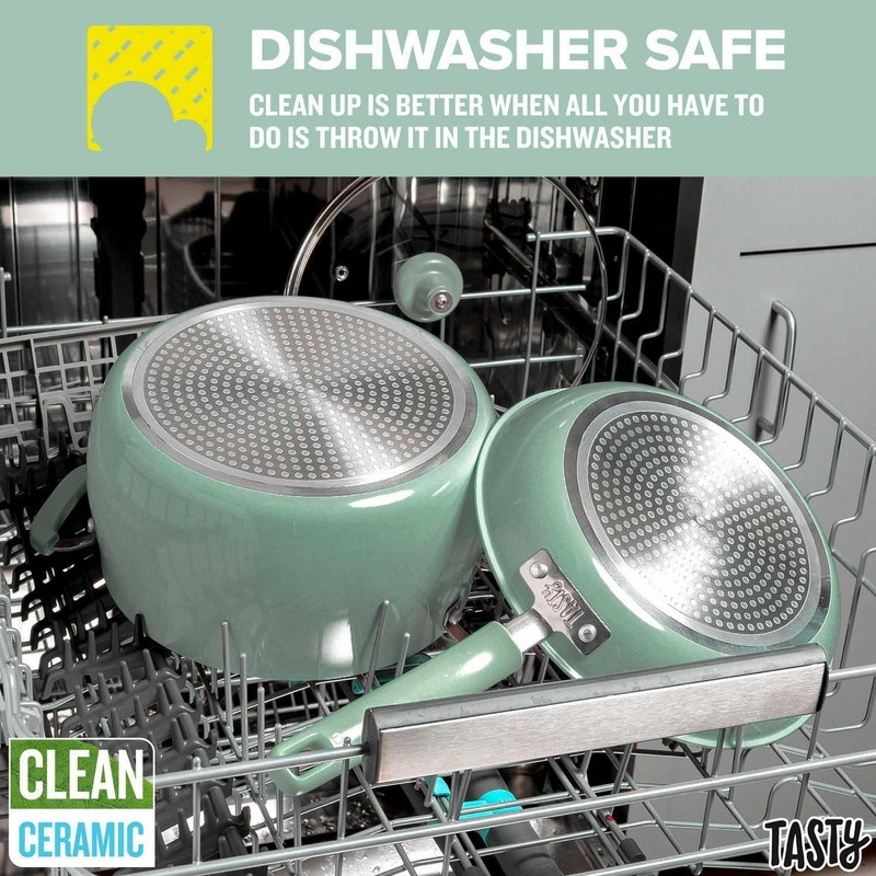 Better, Stronger, Longer-Lasting Non-Stick: This pots and pans set features a premium, reinforced Clean Ceramic non-stick coating that allows food to easily slide out of the pan Metal Utensil Safe: The durable non-stick is metal utensil safe, though we still recommend using silicone, wood or nylon tools when cooking A Pinch of This: Use the included ceramic bowls to pre-measure ingredients and make up sauces in advance to make cooking a breeze- comes in 6 ounce, 4 ounce and 2 ounce sizes Dishwasher Safe for Easy Cleaning: These pans are as easy to clean as they are to use and are dishwasher safe for fast and easy clean-up The Right Tools for the Job: The turner and spoon are heat resistant and safe to use on non-stick surfaces Awesome Quality: This cookware's heavy duty construction heats quickly and evenly Stack and Protect: Included cookware protectors (11.5 inch and 13.5 inch) are perfect for stacking and storing cookware without worrying about scratches Healthy Cooking: The ceramic non-stick coating is made without PFAS, PFOA, PTFE and PFOS Suitable for All Cooking Surfaces: Use this cookware on induction, electric, gas and glass! Pots and pans feature a stainless steel induction base Includes: 8 inch fry pan, 9.5 inch fry pan, 1.5 quart saucepan with glass lid, 2.5 quart saucepan with glass lid, 5 quart dutch oven with glass lid, 2 piece cookware protectors (11.5 inch and 13.5 inch), solid spoon, slotted turner, 3 piece ceramic prep bowls (6 ounce, 4 ounce and 2 ounce)