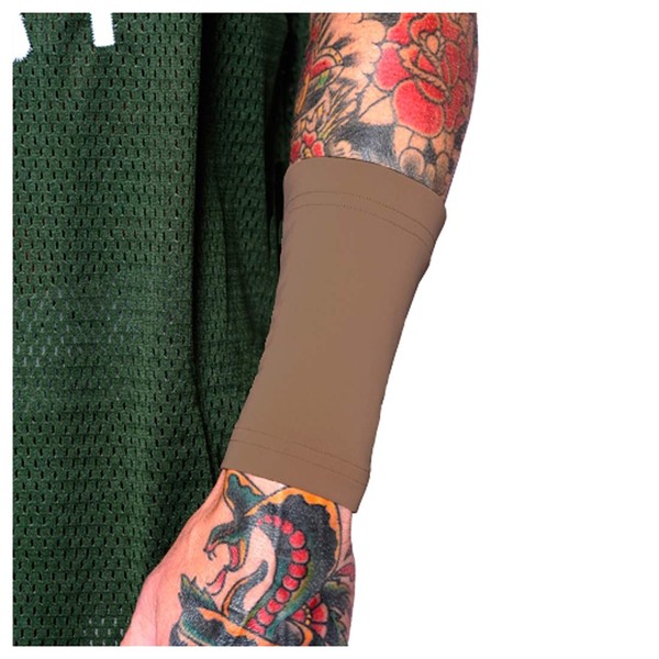 Hiding tattoos at work when you need to has never been so easy. Our Ink Armor six inch forearm sleeves are perfect tattoo cover ups for work or school. There's no need for makeup or long sleeves or ace bandages. Tat2X has you covered with our Ink Armor forearm cappuccino tattoo cover.